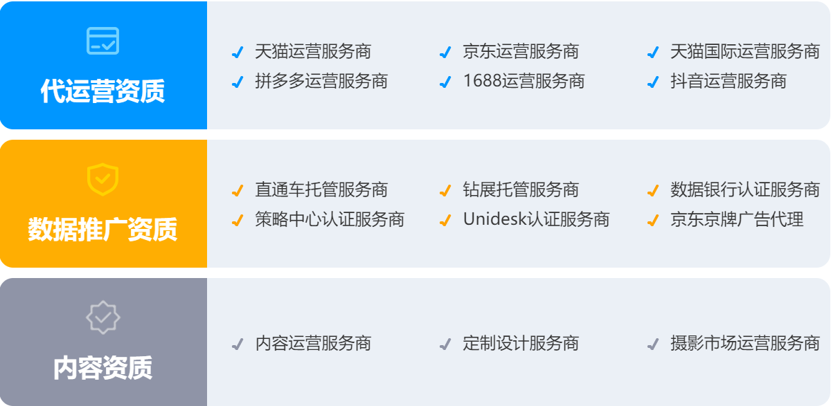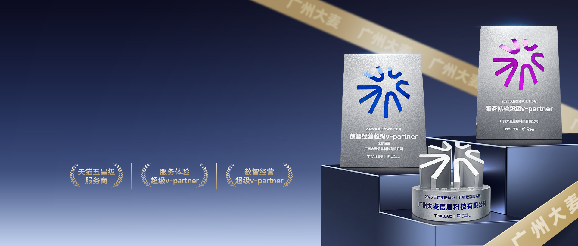 天猫五星级认证服务商,阿里全域运营及京东、拼多多、抖音等多方认证服务商;获得广东省电子商务100强企业、互联网新商业十年高质量发展企业等称号